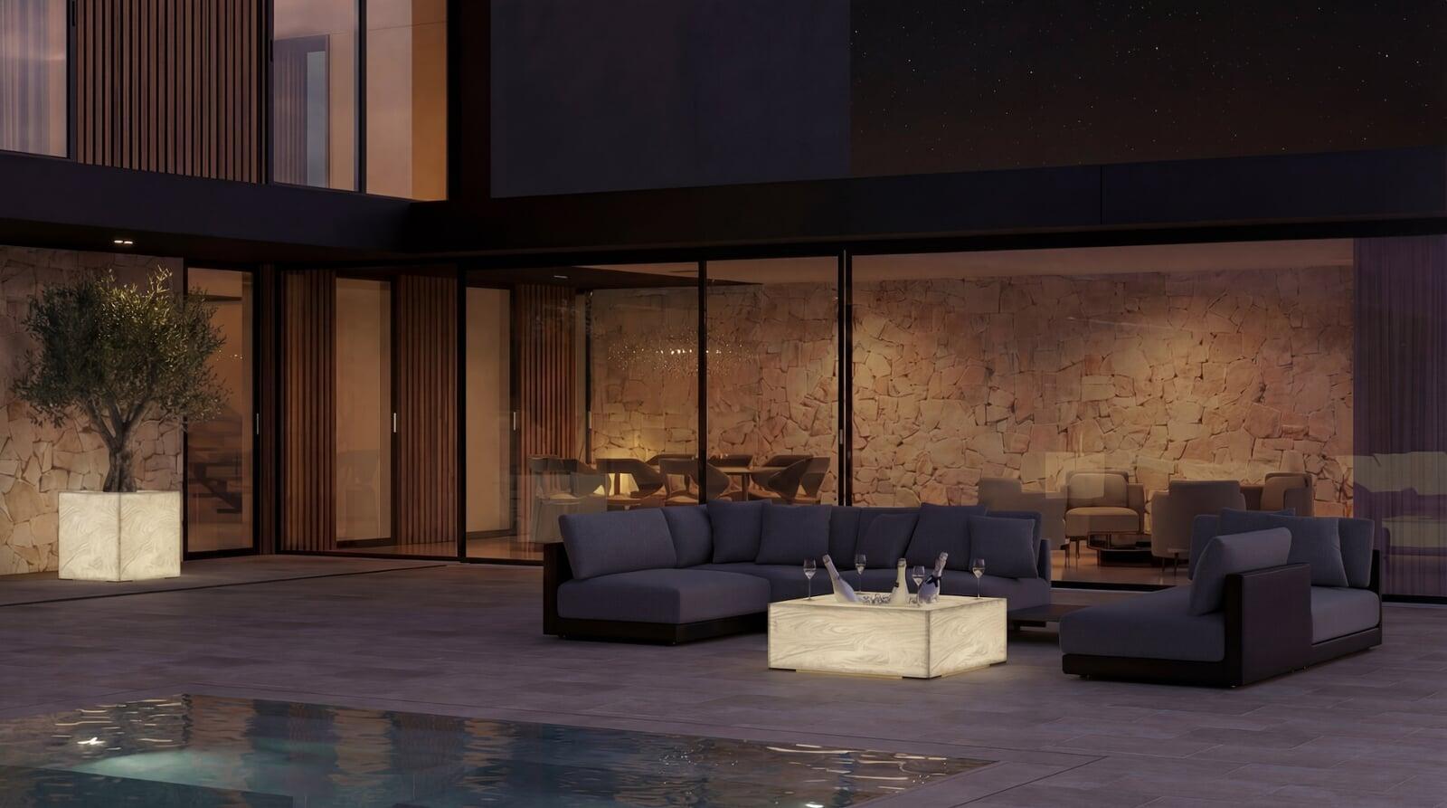 Leuchtender Tisch mit integrierter Flaschen-Hubsäule inszeniert Terrassen- und Loungebereiche.