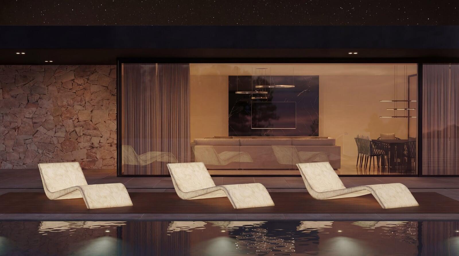 Leuchtende Ruheliege mit skulpturaler Präsenz – inszeniert Pool-, Spa- und Loungebereiche.