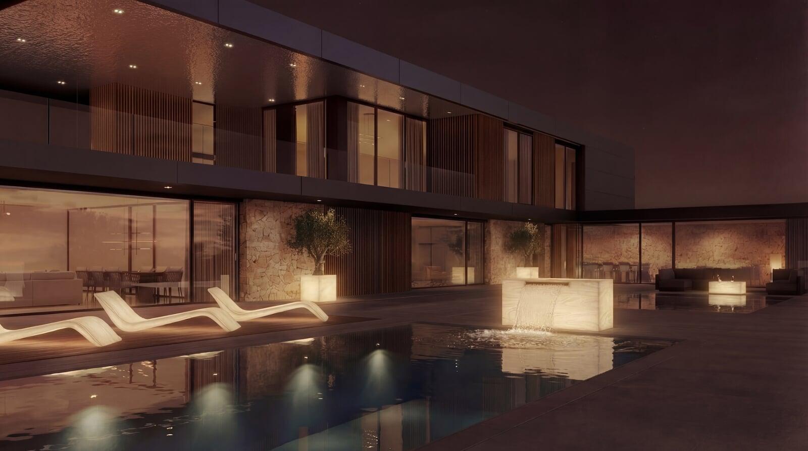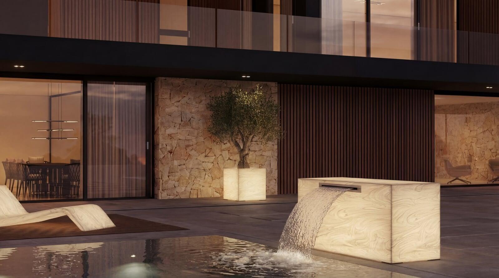Leuchtendes Wasserobjekt mit ruhiger horizontaler Präsenz – inszeniert Pool- und Terrassenzonen.